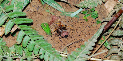 剛過去的週末,我在野外,卻看到了並不「摙土作房」,而在土裏挖洞的細腰蜂。這大概是一種專門捕獵蜘蛛的寄生蜂,就叫個蛛蜂 Pompilidae. 牠看上了我天篷下面鋪了蕨葉作「地毯」的小片禿地,就在那裏挖洞,讓我有觀察、攝影之便。