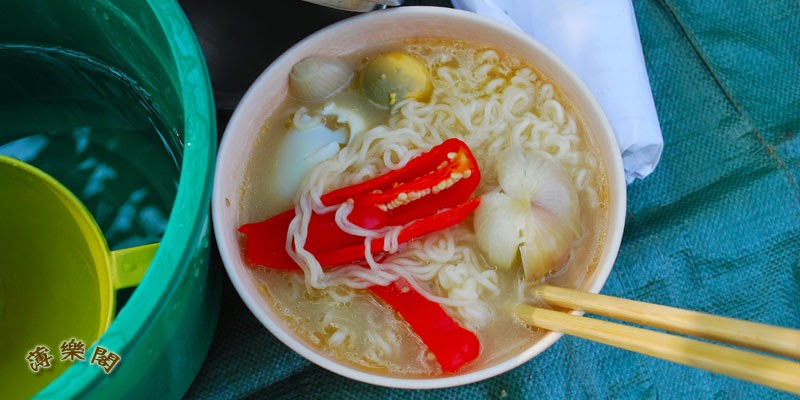 下午1點45分,我到達羅箕灣營地,這裏有清潔的山澗引水,我於是可以吃上這次旅程的第一頓了。為了方便快捷,這當然不可能是米飯,而是方便麵。配菜只有熟雞蛋,蔥頭和不辣的大辣椒。我選擇了一處有矮樹叢給擋風的營地,匆促設灶為炊。