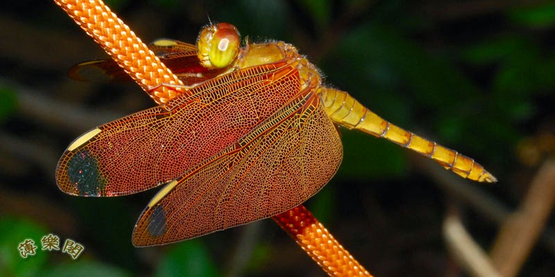 蜻蜓的種類很多,性格各異。這一天,營地飛來了一隻膽子挺大的,停駐在我的篷繩上曬太陽。我走近去照相,牠不怕我,多番豎起翅膀,顫動幾下,虛張聲勢,大抵試圖把我嚇跑。可我也不怕牠,給牠照了好幾幀特寫。