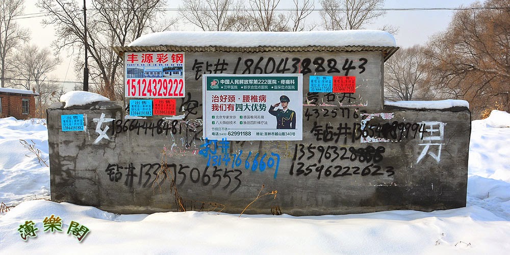 離開「萬人坑」,一路賞看農村雪景,途中看到一所比較原始的茅坑公廁,後面外牆充當了廣告板,正中位置貼著一張「中國人民解放軍第222醫院疼痛科」的廣告,聲言他們「有四大優勢」去「治好頸、腰椎病」,其一是「北京專家坐診」,另一是「獨創四階梯療法」;並有插圖,一位年輕軍官肅立敬禮,好不威武!但牆上最多的是鑽井服務的聯繫電話號碼。另有幾張農業廣告,全都一致出售葡萄苗、果樹苗、綠化苗和藥材苗。